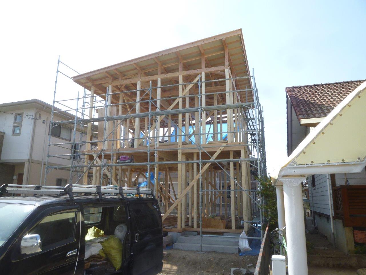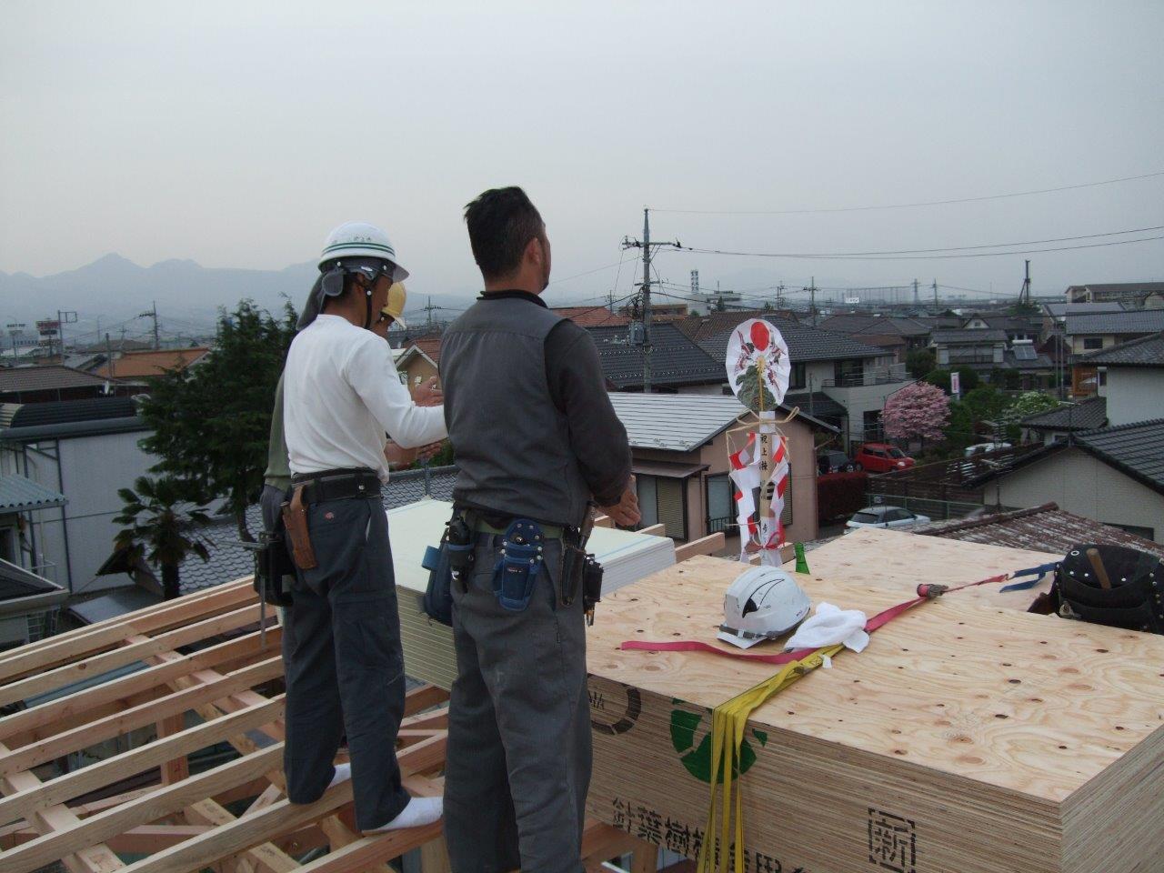 上棟 高崎市で進行中のT様邸が無事に上棟になりました 天候にも恵まれ、上棟日和でした 延床面積30坪のコンパクトな住宅です 施主様は不在でしたが、屋根の上では大工さんが四方固めを 行いました、昔は御餅やお菓子を投げたりと盛大に行いましたが 今ではこのような風習がほとんどなくなってしまいました。 少し寂しい気はしますが、時代の流れなのでしょうか・・・ T様、本日はおめでとうございます。