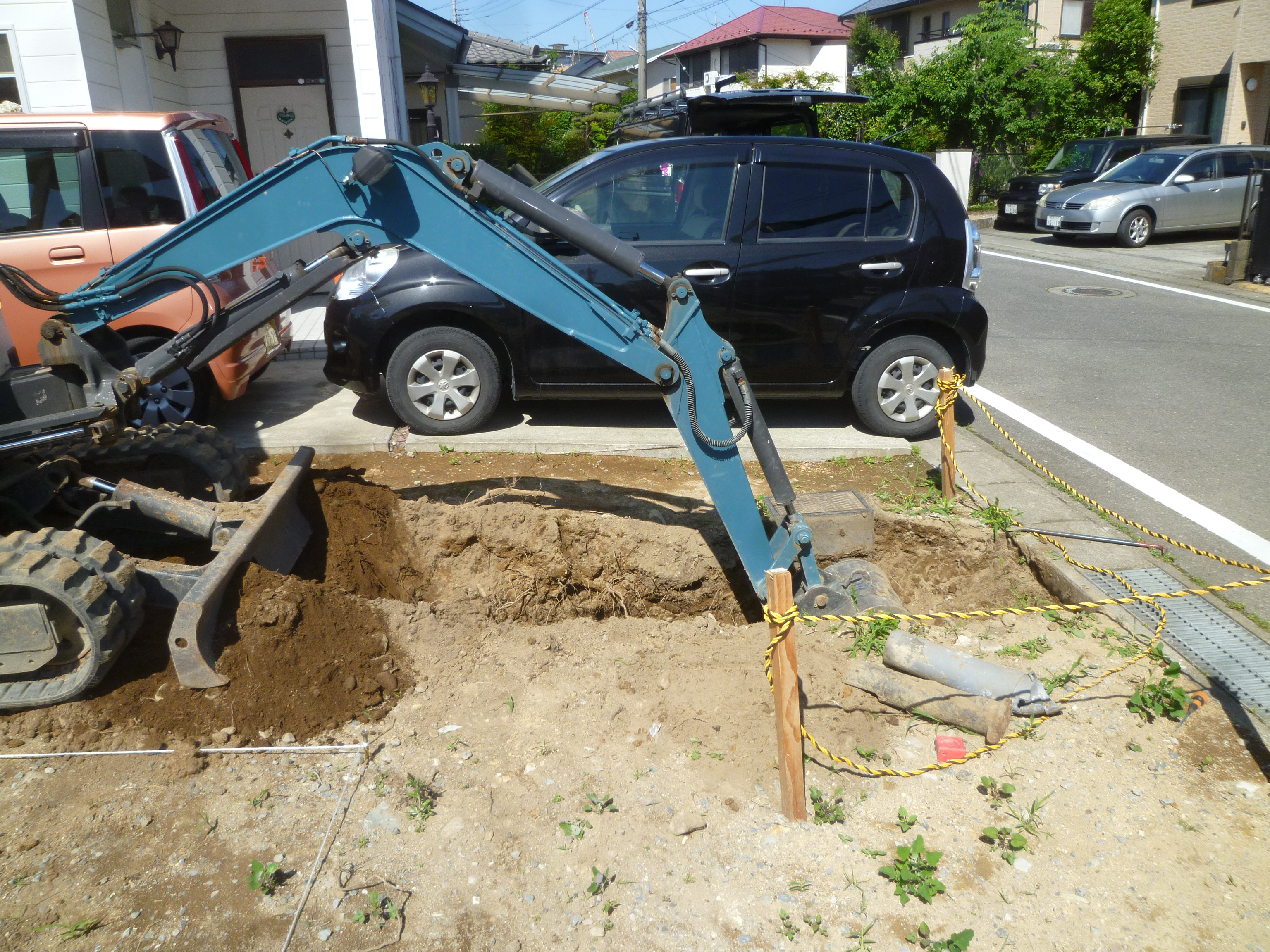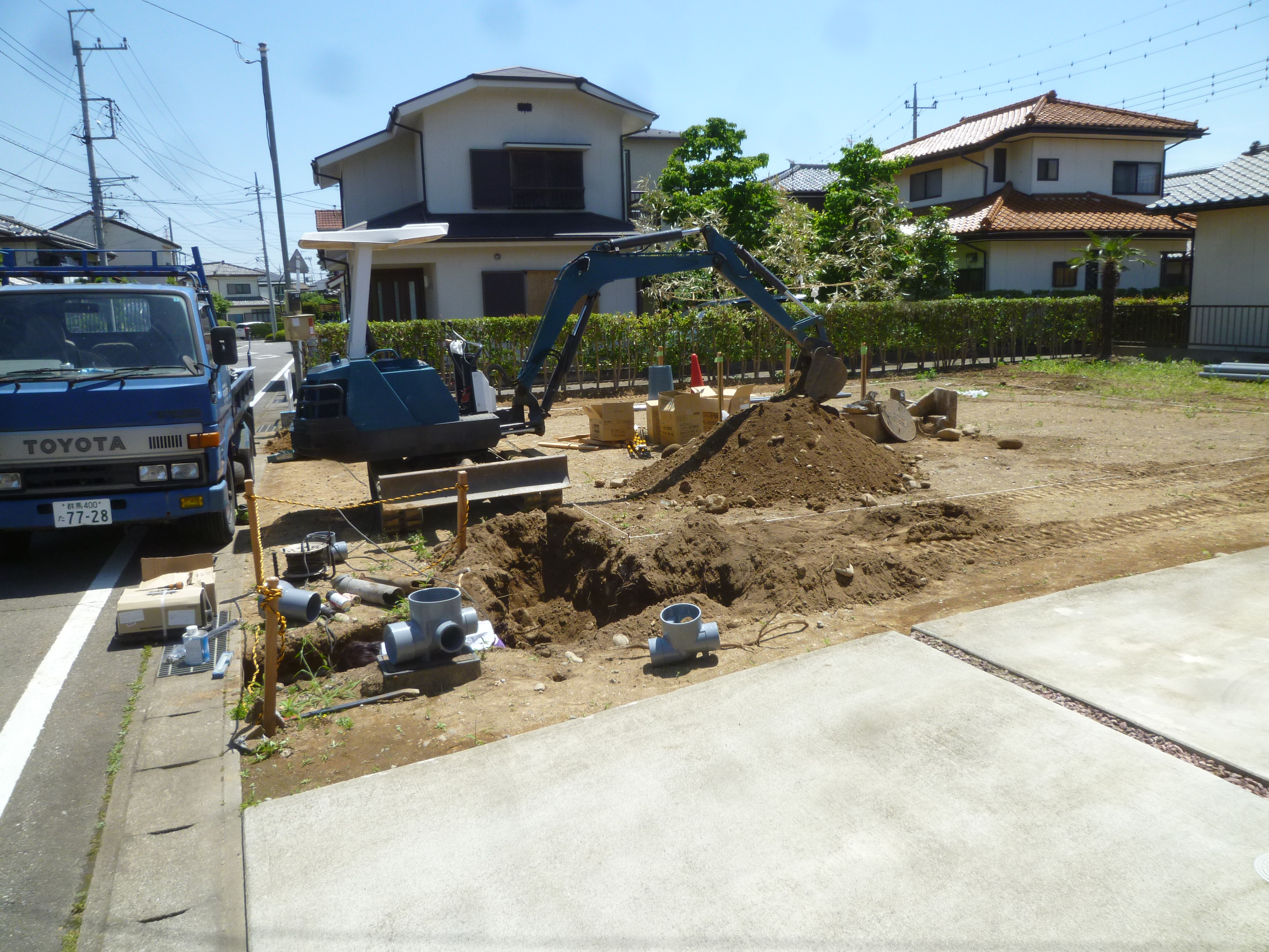 工事着手 前橋市のF様邸では、先日、地鎮祭が執り行われ、今日から外部 給排水の工事が始まりました。 基礎工事の後ですと、重機が入れなくなってきたりして いろいろと作業効率が悪くなってしまいます 建物の配置に合わせ掘っていき、排水管や給水管を一通り布設して いきます、おおよそ3日位で工事が終了し、来週から基礎工事へと 入っていきます。
