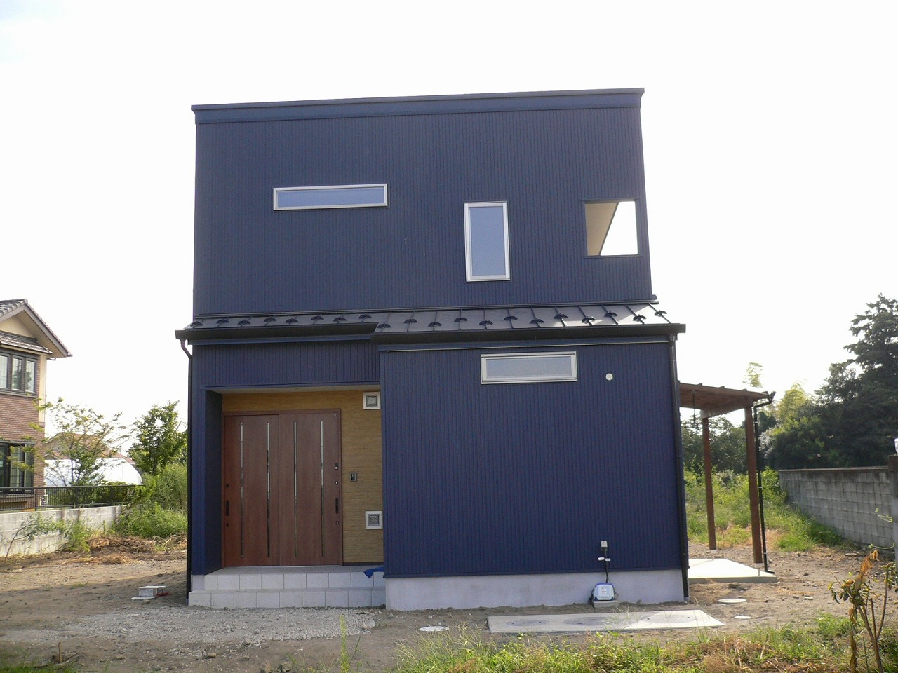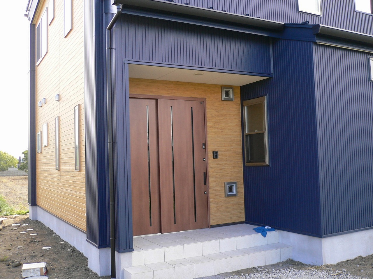 青いガルバリウム鋼板を軸とし一部木質系サイディングを使いあたたかみを出しました。