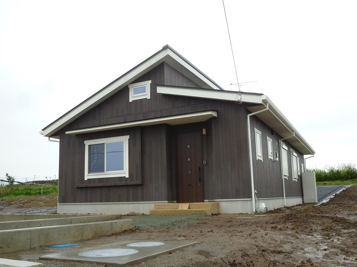 黒のガルバ二ウム鋼板の屋根に、外壁は木目調のサイディングを使いサッシ廻りに白のモールを付けることによりアクセントを付けています。