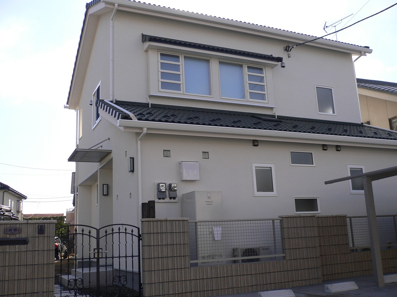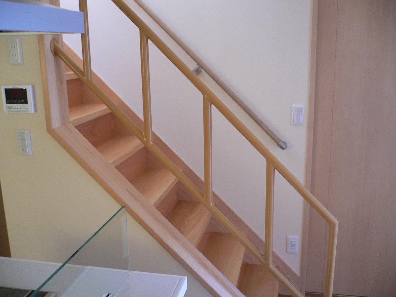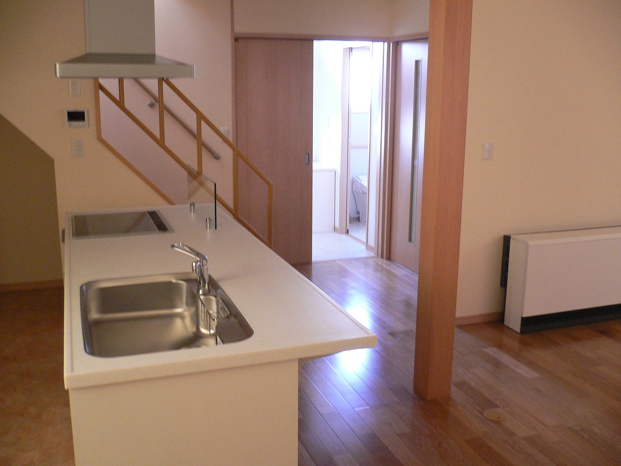 WORKS#NEW-BUILD 太陽光の家 屋根に太陽光パネルを設置した省エネ住宅です。 内部はナラの無垢板のフローリングをはり、また洗面室と脱衣室が区切られている為、 入浴前に衣類が乱雑になることもありません。 階段の手すりは鉄製にすることで、インテリアの一部とし、 また、壁を利用した本棚が設置してあり細かいところも工夫することで収納スペース等を増やすことができます。