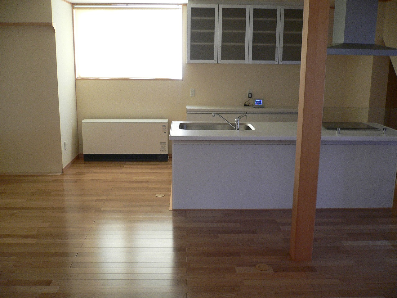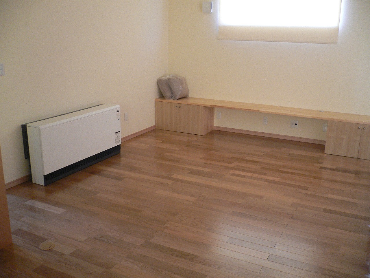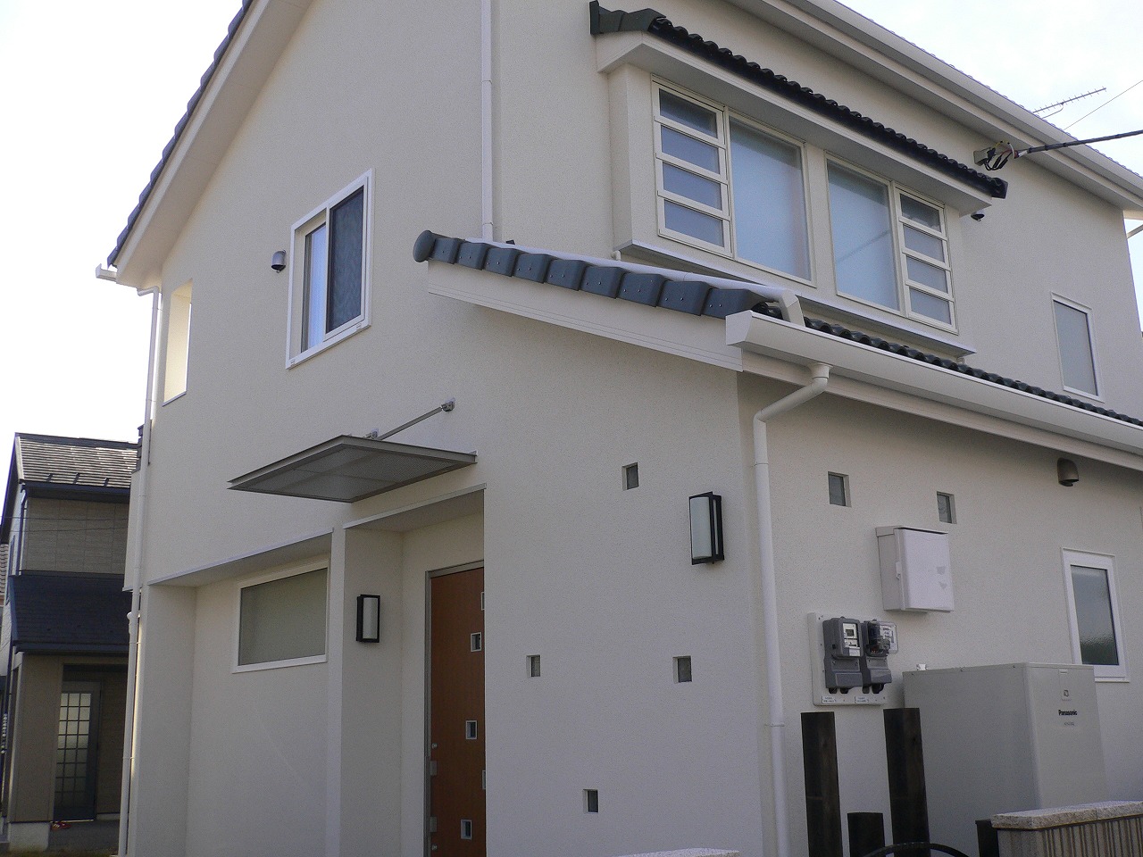 WORKS#NEW-BUILD 太陽光の家 屋根に太陽光パネルを設置した省エネ住宅です。 内部はナラの無垢板のフローリングをはり、また洗面室と脱衣室が区切られている為、 入浴前に衣類が乱雑になることもありません。 階段の手すりは鉄製にすることで、インテリアの一部とし、 また、壁を利用した本棚が設置してあり細かいところも工夫することで収納スペース等を増やすことができます。