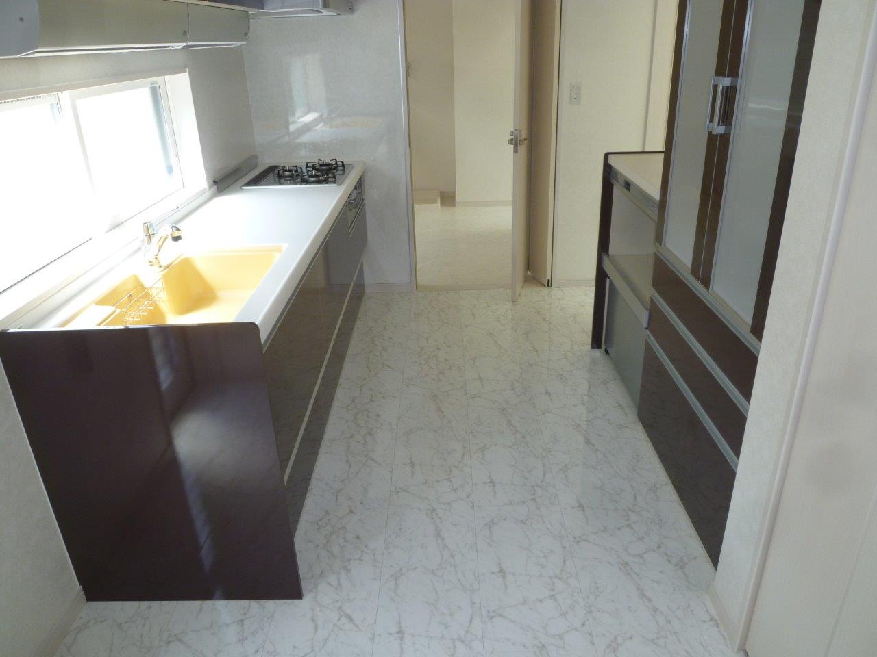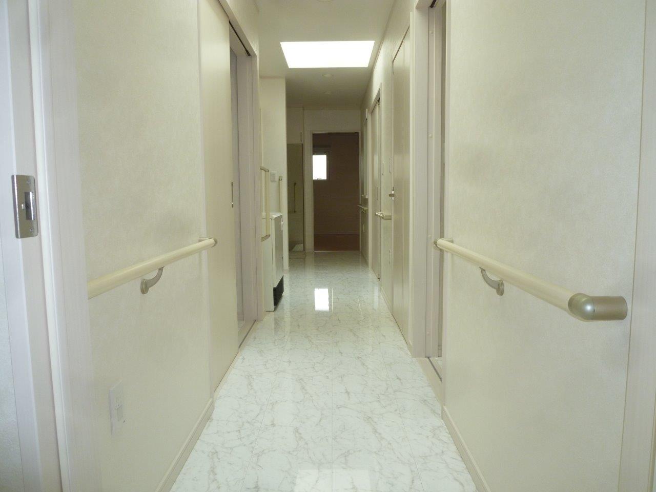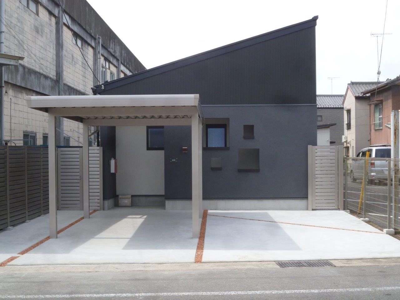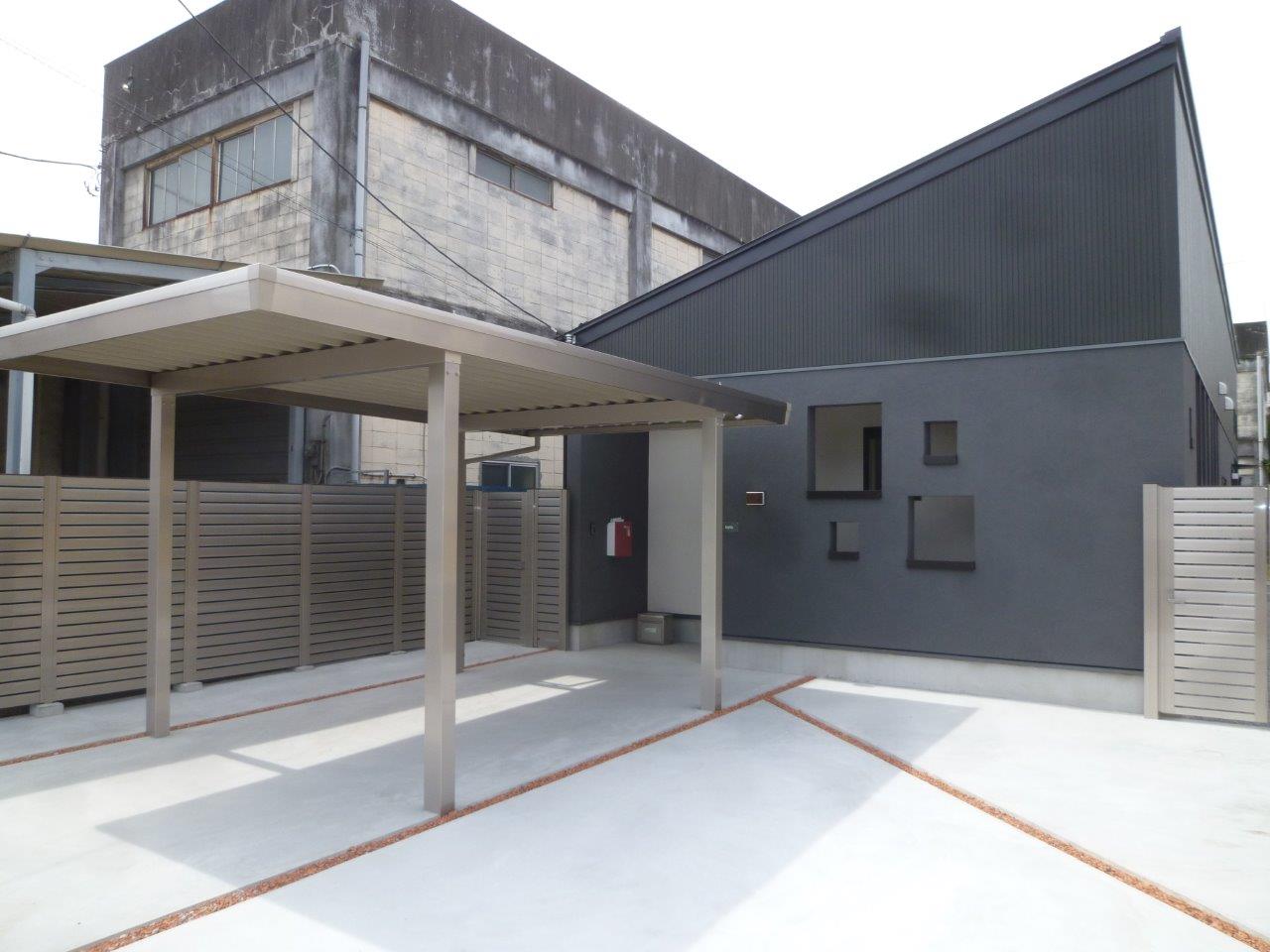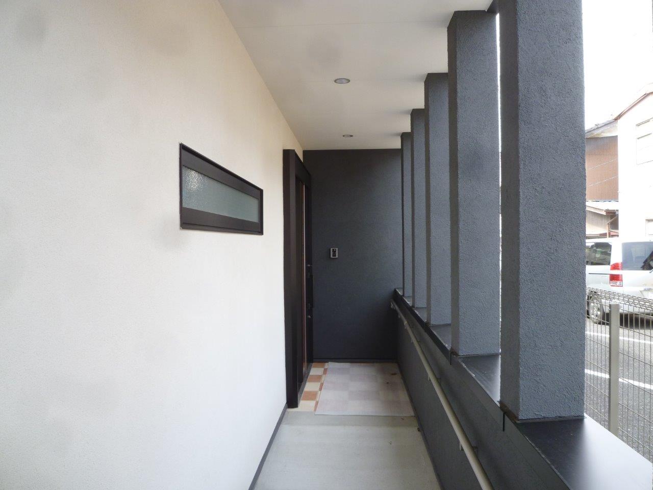WORKS#NEW-BUILD 白と黒の家 外観は窯業系サイディングとジョリパット左官仕上げを組み合わせた平屋の住宅です。(玄関スロープのみ白のジョリパットになっています)屋根やサッシも黒の為、シャープで引き締まった外観になっています。内部は白を基調とした仕上げになっており、フローリングに鏡面調のビアンコ柄を採用することにより、宮殿のような高級感を出しています。また、玄関の長いスロープや引き戸の入り口、内部廊下の手摺など将来を見据えた設計になっております。