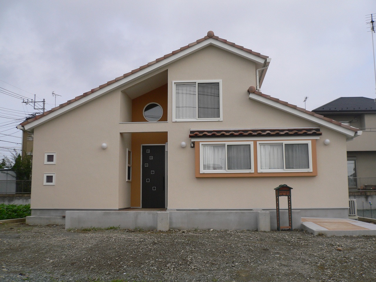 S型瓦を使い、外壁はベージュとオレンジを組み合せ、丸窓をアクセントに。